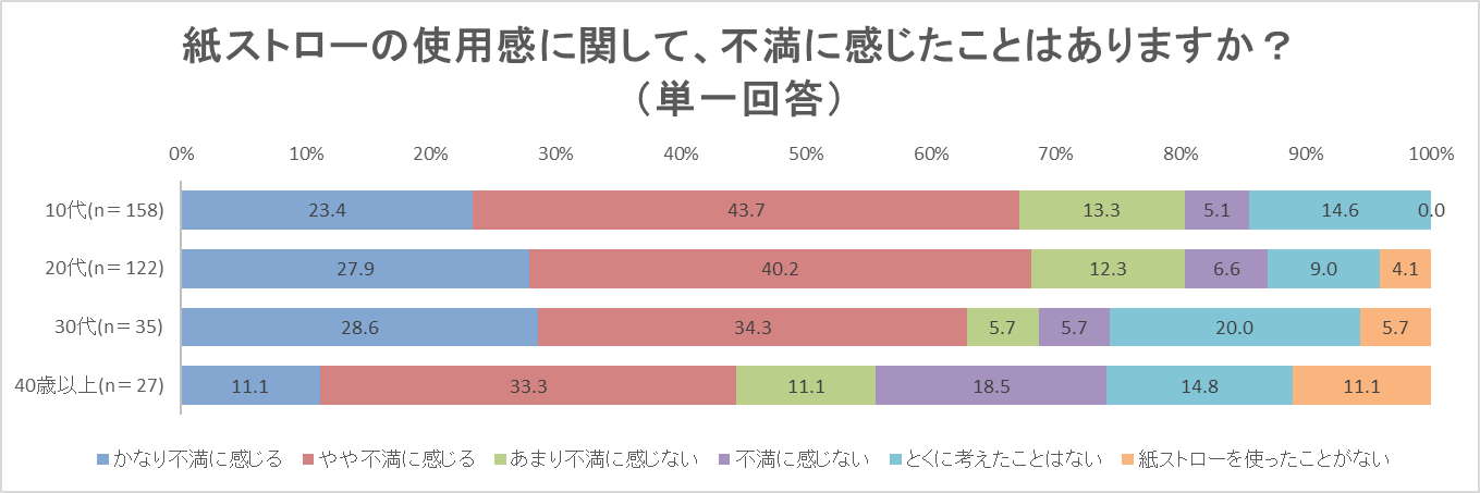 「不満を感じているか」という問い方の影響を受けている可能性もありますが、紙ストローの使い心地については世代を問わず不満を感じている方が多いようです。