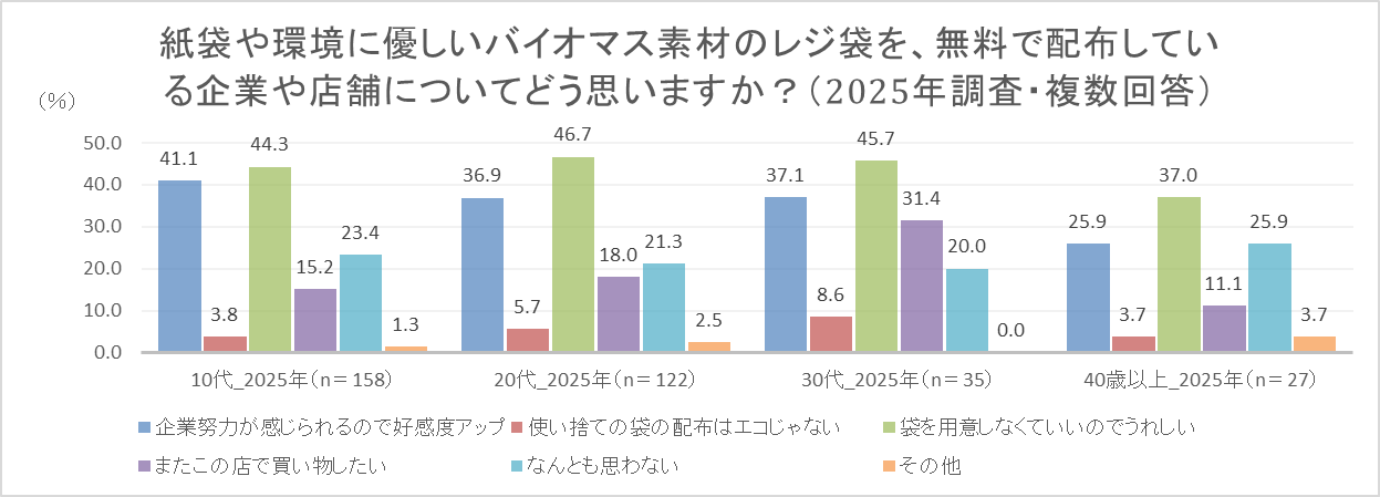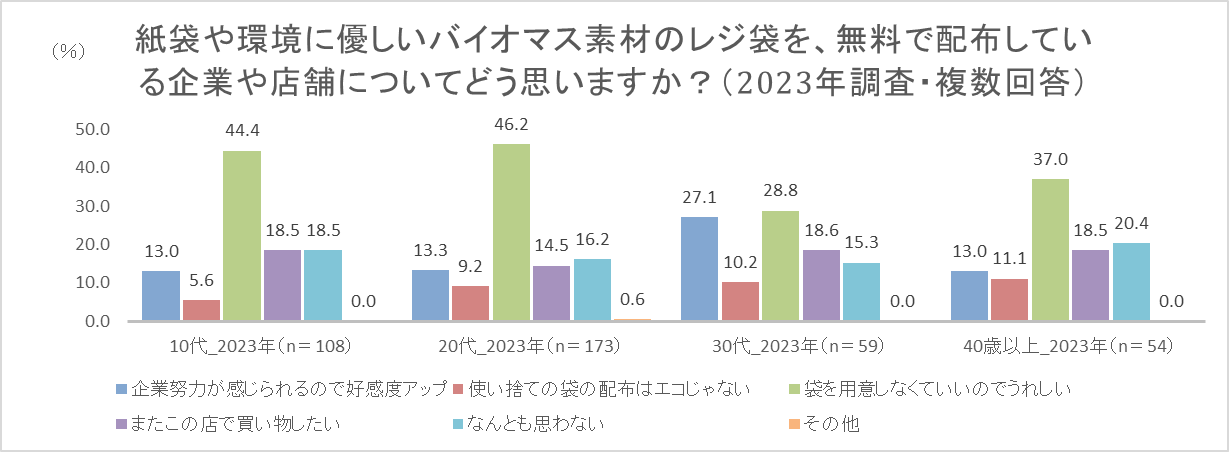 さらに「紙袋や環境に優しいバイオマス素材のレジ袋を、無料で配布している企業や店舗についてどう思いますか?」という質問にも、「袋を用意しなくていいのでうれしい」がどの世代も最も高くなりました。