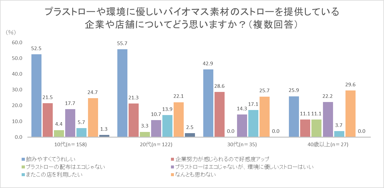 「プラストローや環境に優しいバイオマス素材のストローを提供している企業や店舗についてどう思いますか?」と聞いてみると、10代と20代では半数以上の方が「飲みやすくてうれしい」と回答する結果になりました。