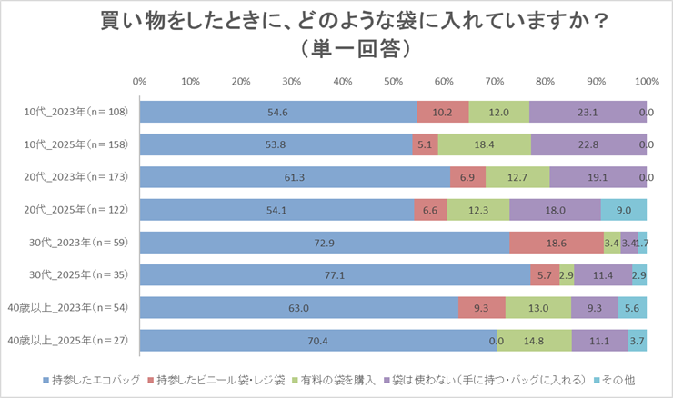 全世代において半数以上の方が「持参したエコバッグ」と回答しているのは2023年、2025年の結果を通して変わりませんでした。