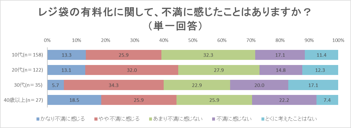 「レジ袋の有料化に関して、不満に感じたことはありますか?」という質問に対しては、20代〜40代以上は「やや不満に感じる」が最多なのに対し、10代だけが「あまり不満に感じない」が32.3%と最も多くなっています。
