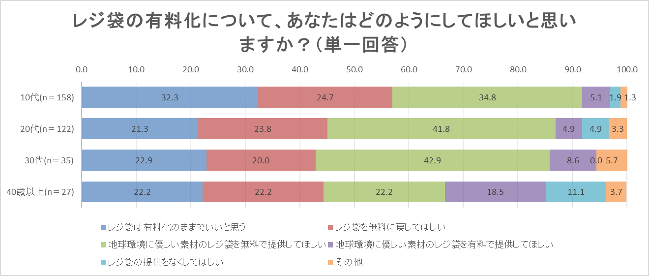 さらに「レジ袋の有料化について、あなたはどのようにしてほしいと思いますか?」と聞いてみると、全世代で「地球環境に優しい素材のレジ袋を無料で提供してほしい」が最も多くなりました。