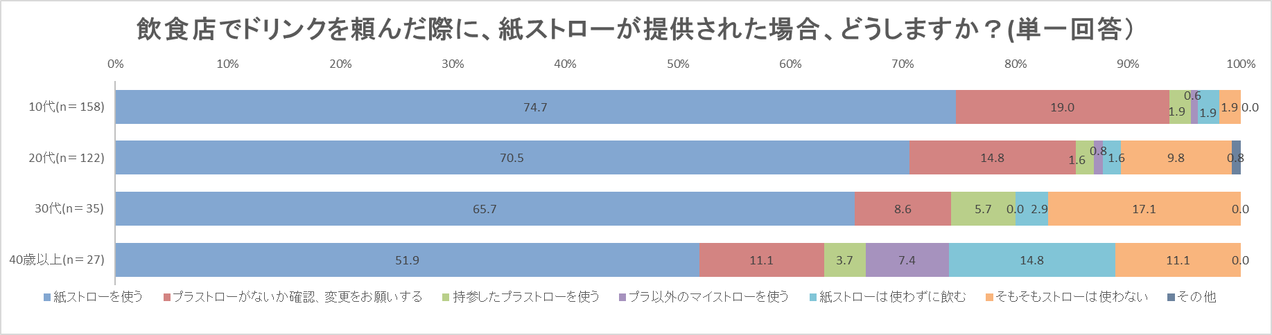 ただ、10代は「プラストローがないか確認、変更をお願いする」が19%と他の世代よりもやや多い傾向となりました。