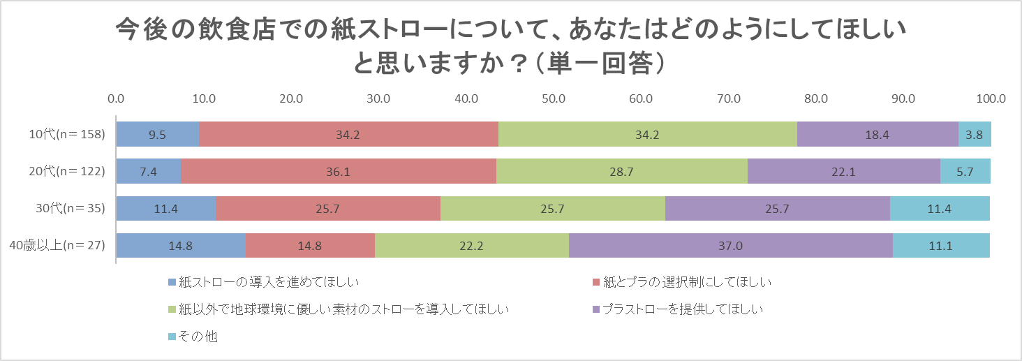 20代では「紙とプラの選択制にしてほしい」が最多で、10代と30代は「紙とプラの選択制にしてほしい」「紙以外で地球環境に優しい素材のストローを導入してほしい」が同率となりました。