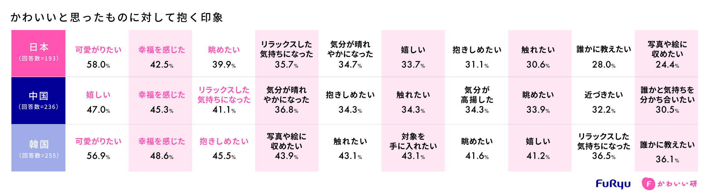 3ヶ国を比較してまず特徴的なのは、3ヶ国共通して「幸福感を感じた」が2位であること、日韓で1位の「可愛がりたい」が中国では少ないこと。また、韓国では「抱きしめたい」や「触れたい」、「手に入れたい」が順位・比率ともに高く、直接的な接触や所有を求める感情が強いのに対し、日本では「眺めたい」が上位となり、所有欲への刺激は少ない結果となりました。