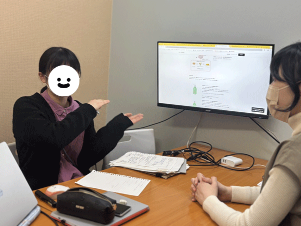 <大手メーカー様・研究員(右)にインタビューするAさん(左)>