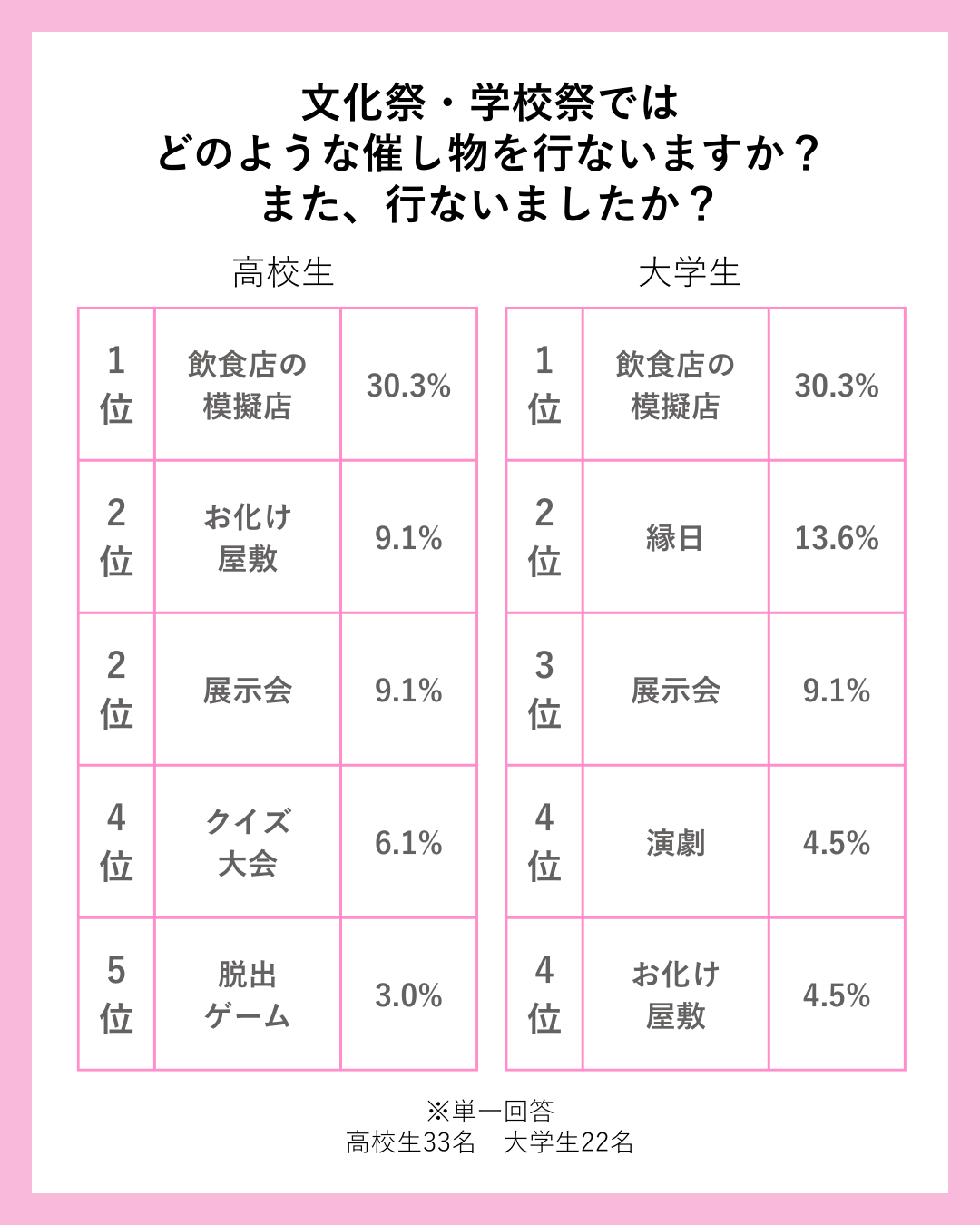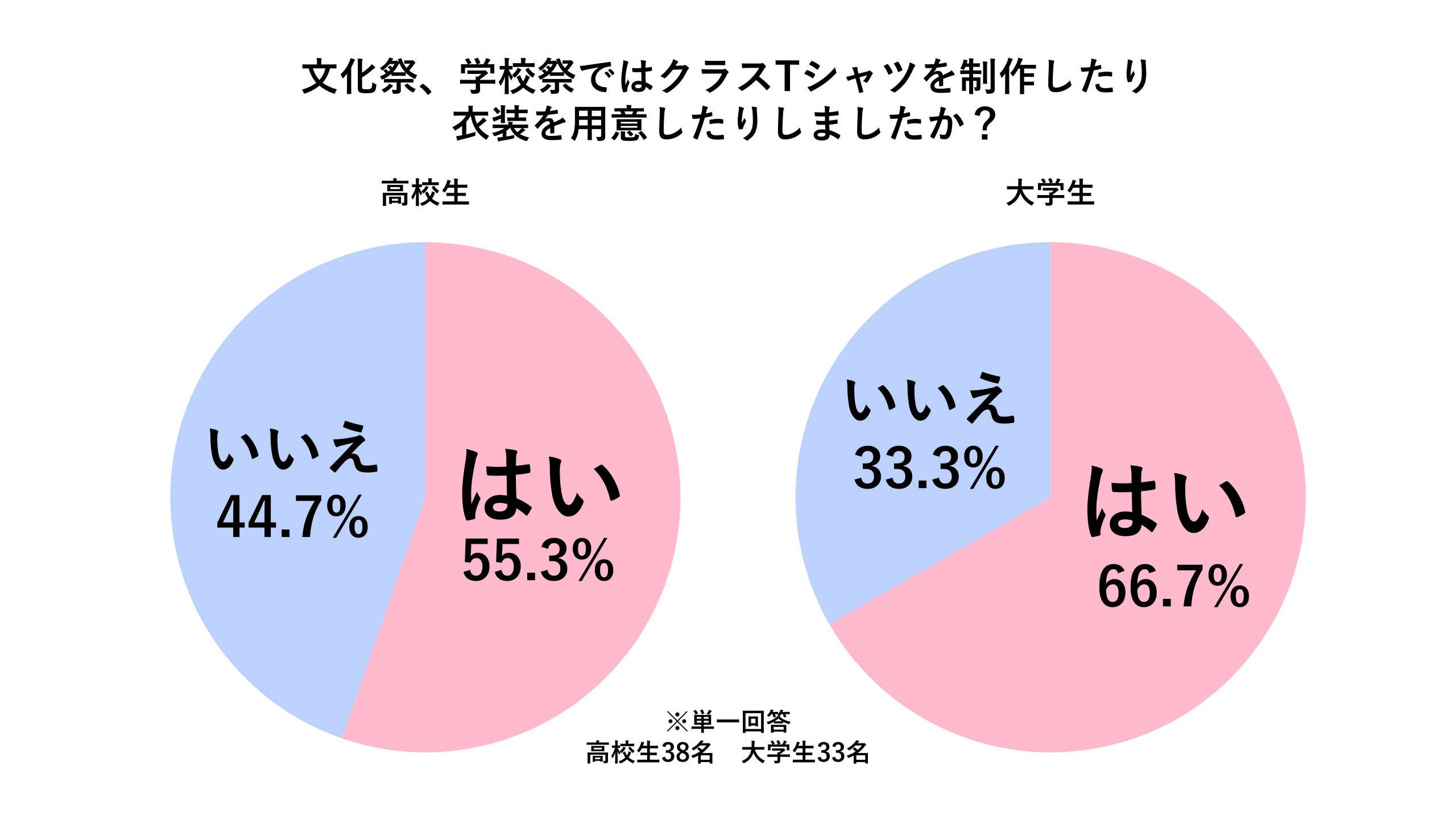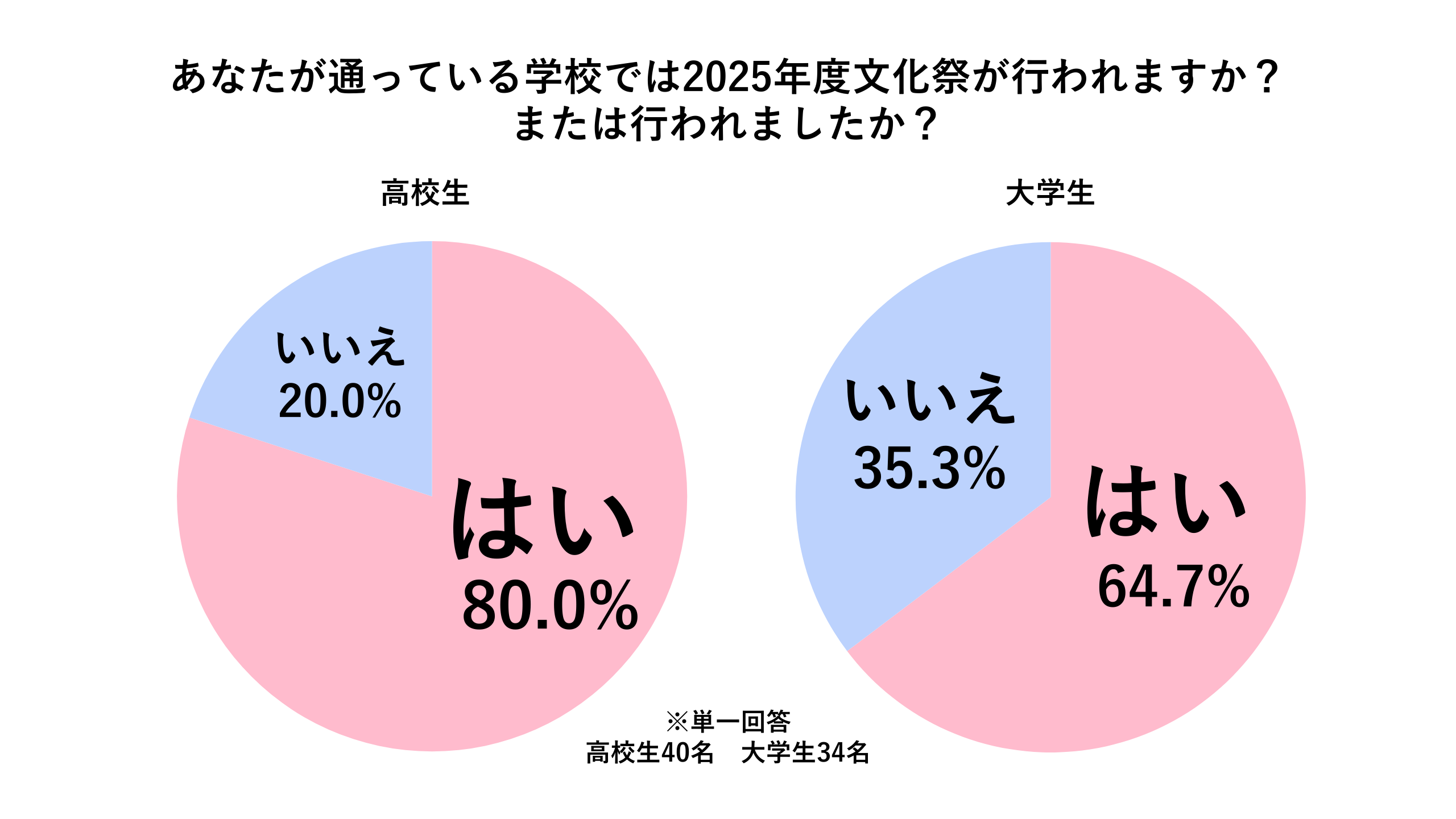 今回アンケートに回答してくれた高校生40名、大学生34名が通う学校では、今年度、半分以上が文化祭を開催予定とのことです。