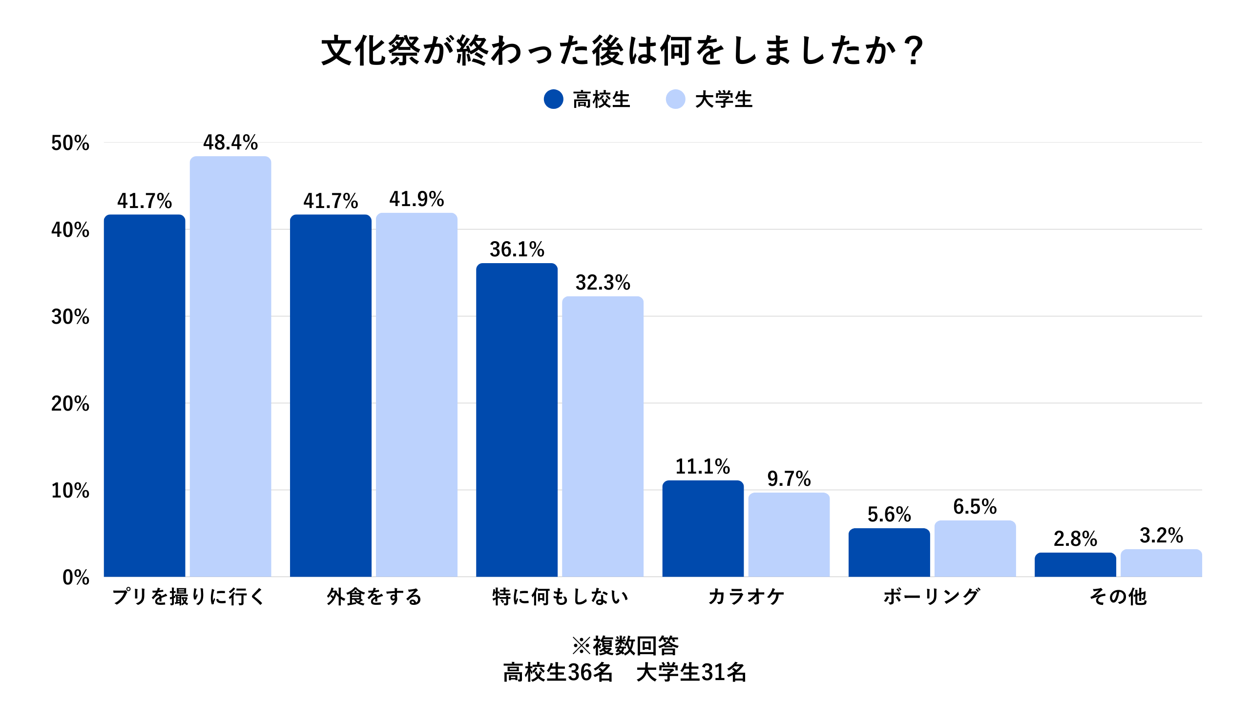 なんと学生の約半数が、文化祭が終わった後にプリを撮りに行くことがわかりました。