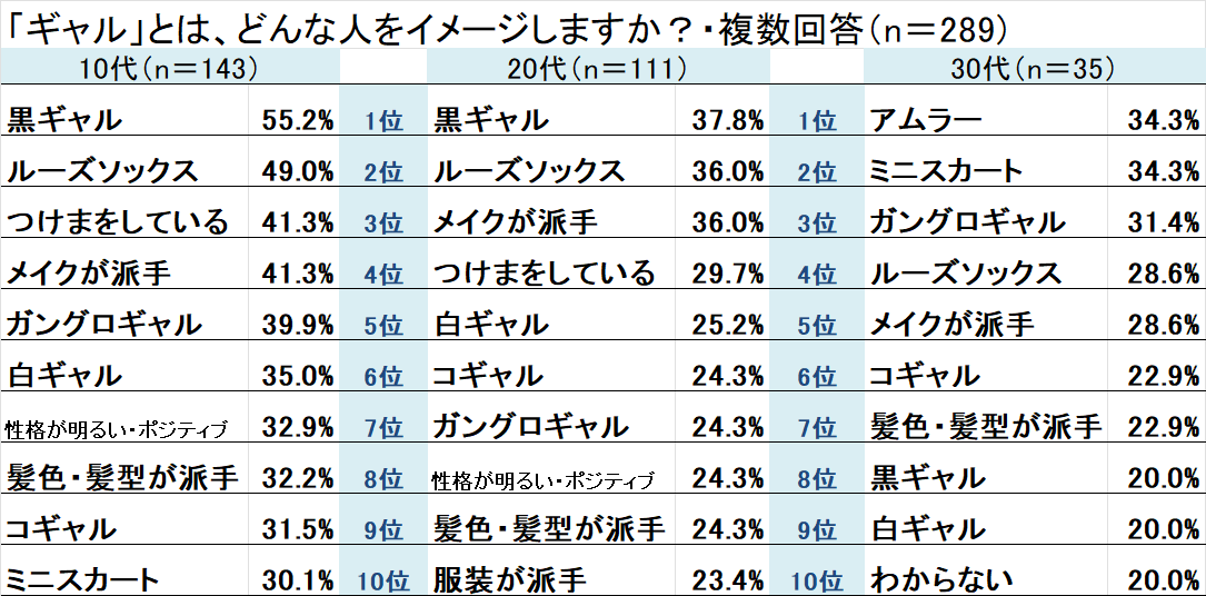 「ギャルとは、どんな人をイメージしますか?・複数回答」と質問したところ、10代で最も多かった回答は「黒ギャル」で55.2%、続いて「ルーズソックス」が49.0%、「つけまをしている」と「メイクが派手」が同率で41.3%となりました。
