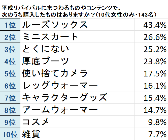 「とくにない」=何も購入していないと回答した方も25.2%いましたが、逆に言えば4人中3人の10代女性が「平成リバイバルブーム」に関連して何らかの消費行動を起こしているということになります。平成リバイバルブームは若年女性の消費行動に少なからず影響を与えていると言ってよさそうです。
