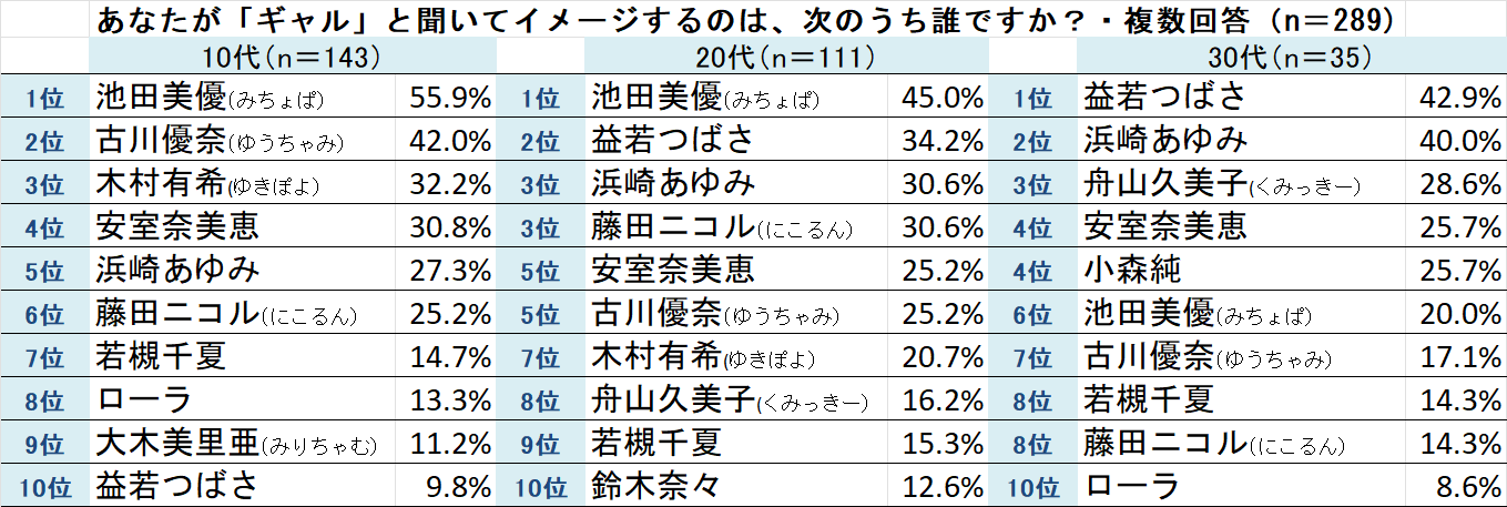 「あなたが『ギャル』と聞いてイメージするのは、次のうち誰ですか?・複数回答」と聞いた結果を各世代ごとにご紹介します。以下、本文中では敬称を省略させていただきます。ご了承ください。