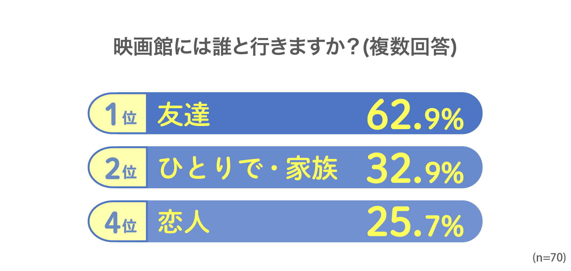 「映画館には誰と行きますか?」という質問に対しては、「友達」が最も多く62.9%でした。2位は「ひとりで」「家族」で同率32.9%、4位は「恋人」で25.7%でした。
