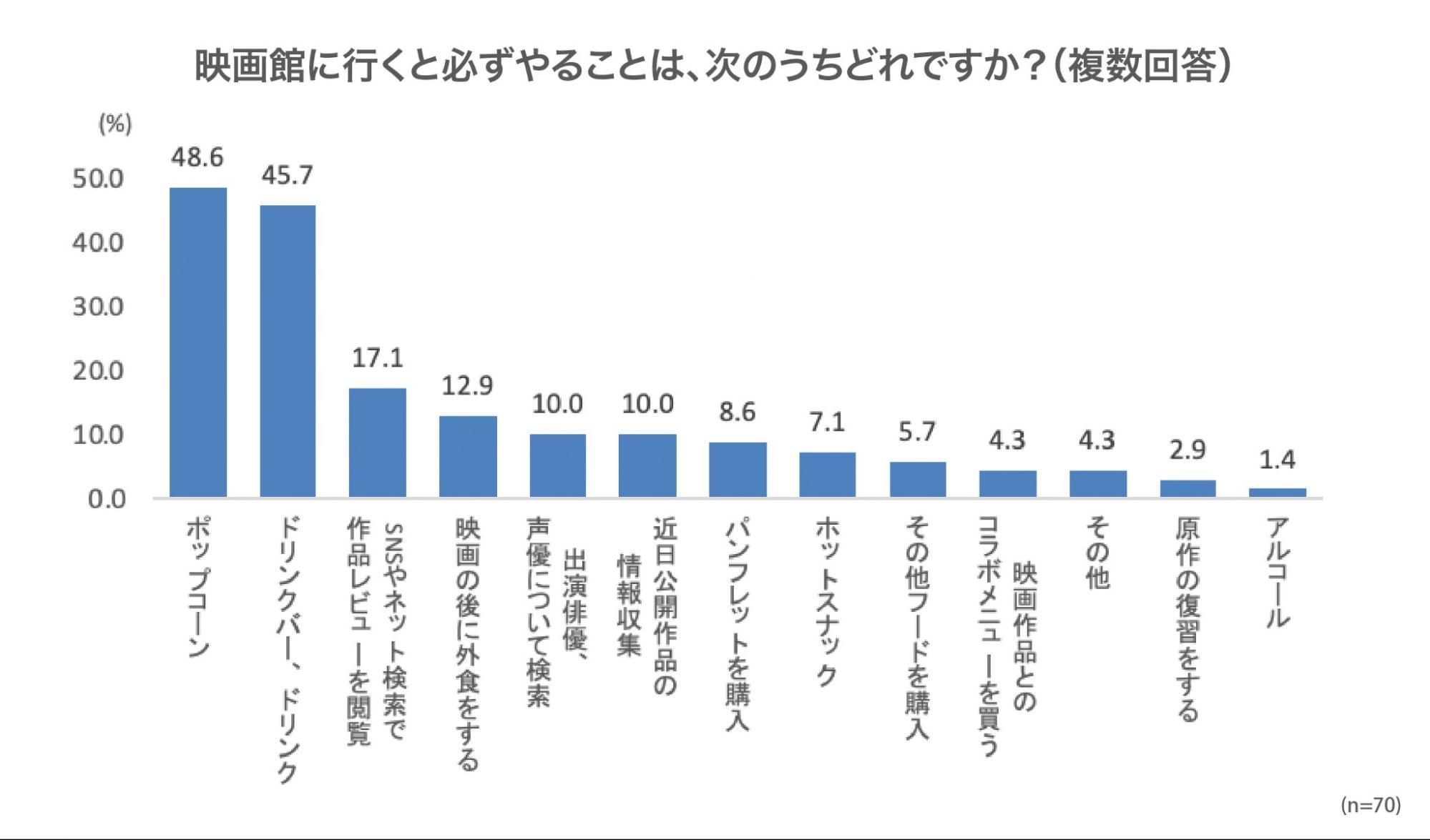 「映画館に行くと必ずやることは、次のうちどれですか?」という質問に対しては、「ポップコーン」と回答した割合が最も多く、48.6%でした。次いで僅差で「ドリンクバー、ドリンク」が45.7%と続きます。その後は数値差があり、「SNSやネット検索で作品レビューを閲覧」は17.1%、「映画の後に外食をする」12.9%、「近日公開作品の情報収集」「出演俳優、声優について検索」10.0%となりました。