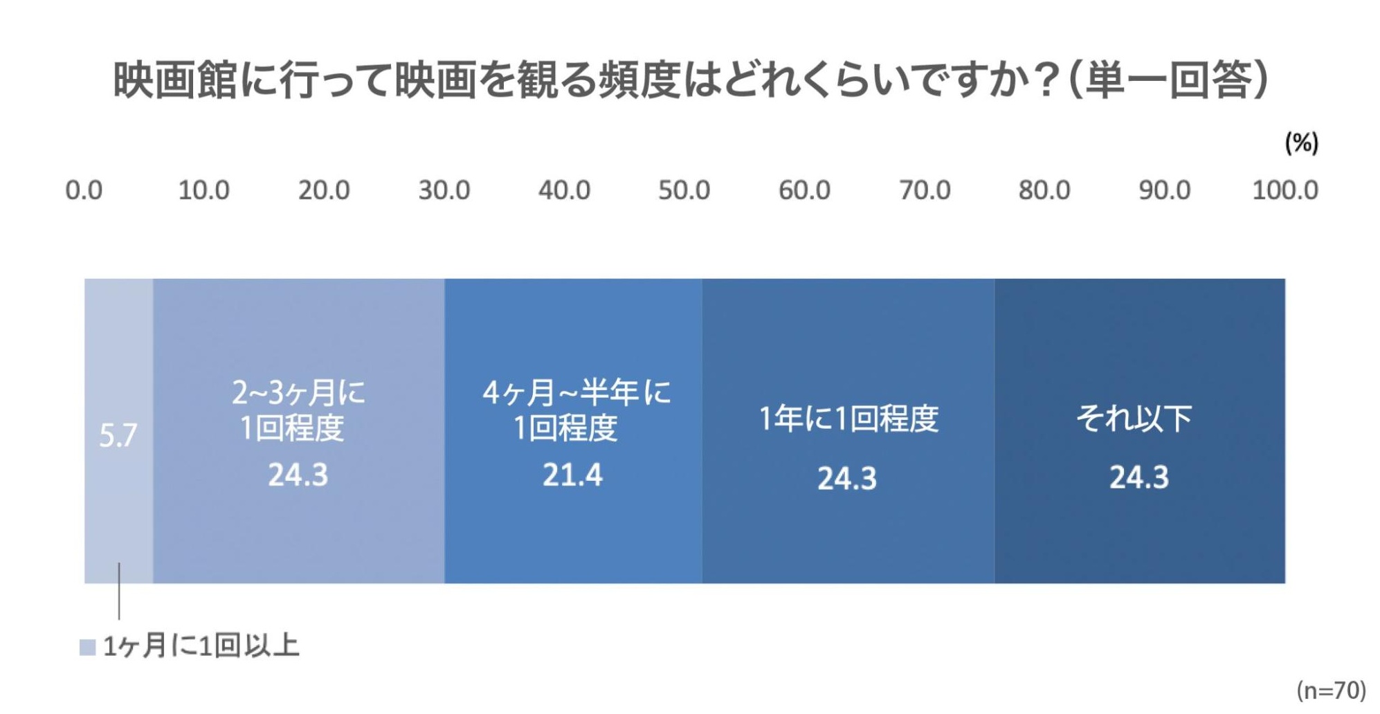 「映画館に行って映画を観る頻度はどれくらいですか?」と質問したところ、「2〜3ヶ月に1回程度」「1年に1回程度」「それ以下」が同率で24.3%、「4ヶ月〜半年に1回程度」が21.4%、「1ヶ月に1回以上」が5.7%となりました。
