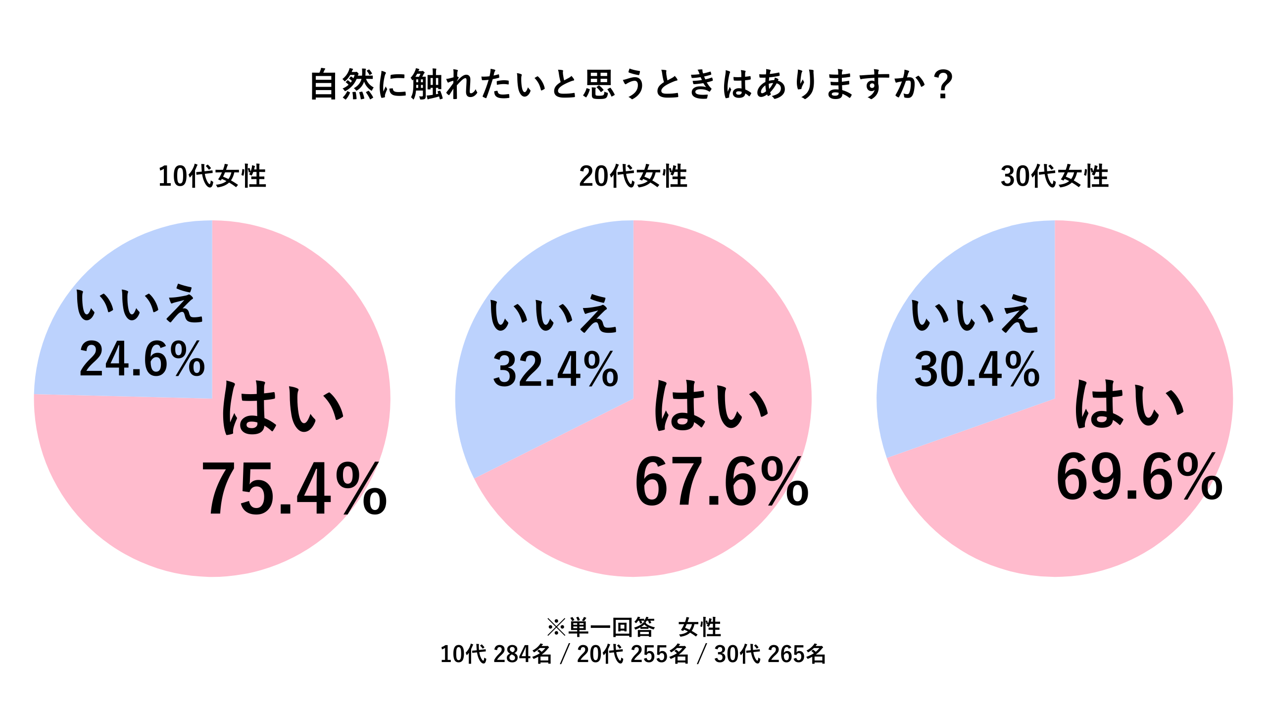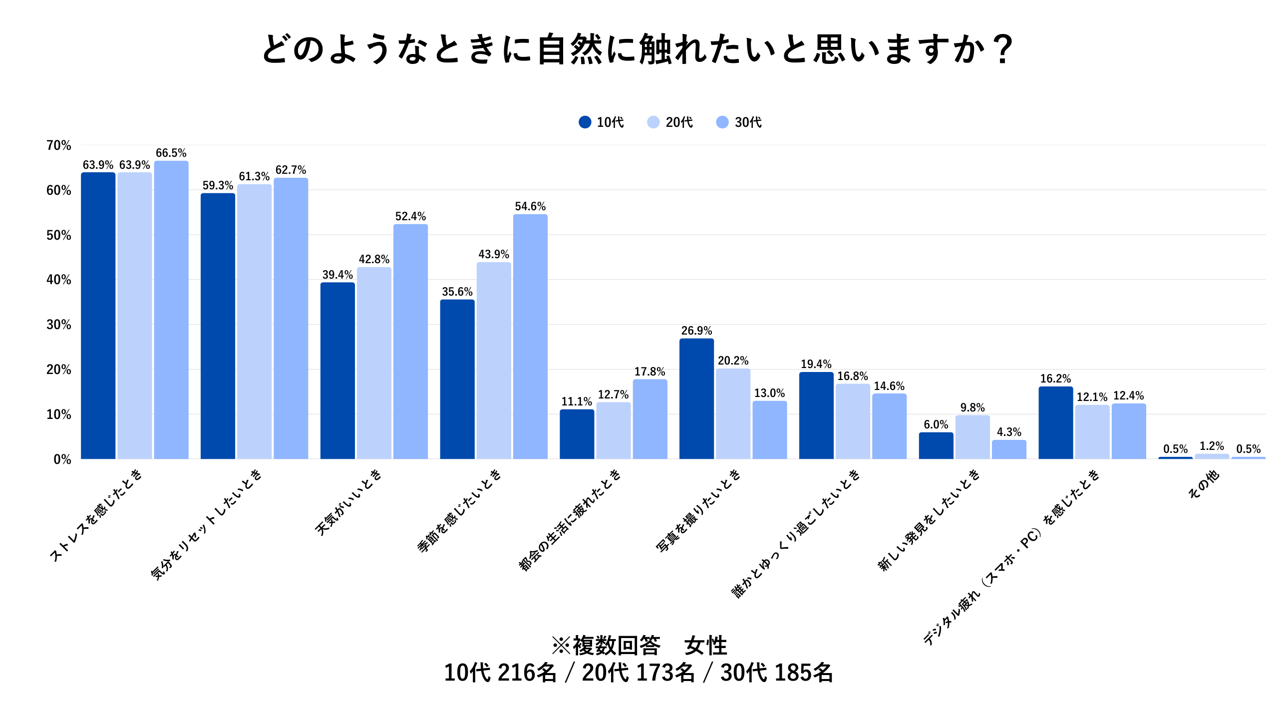 調査の結果からわかるように、自然に触れたいと思っている女性がどの年代も60%以上いることがわかっています。
