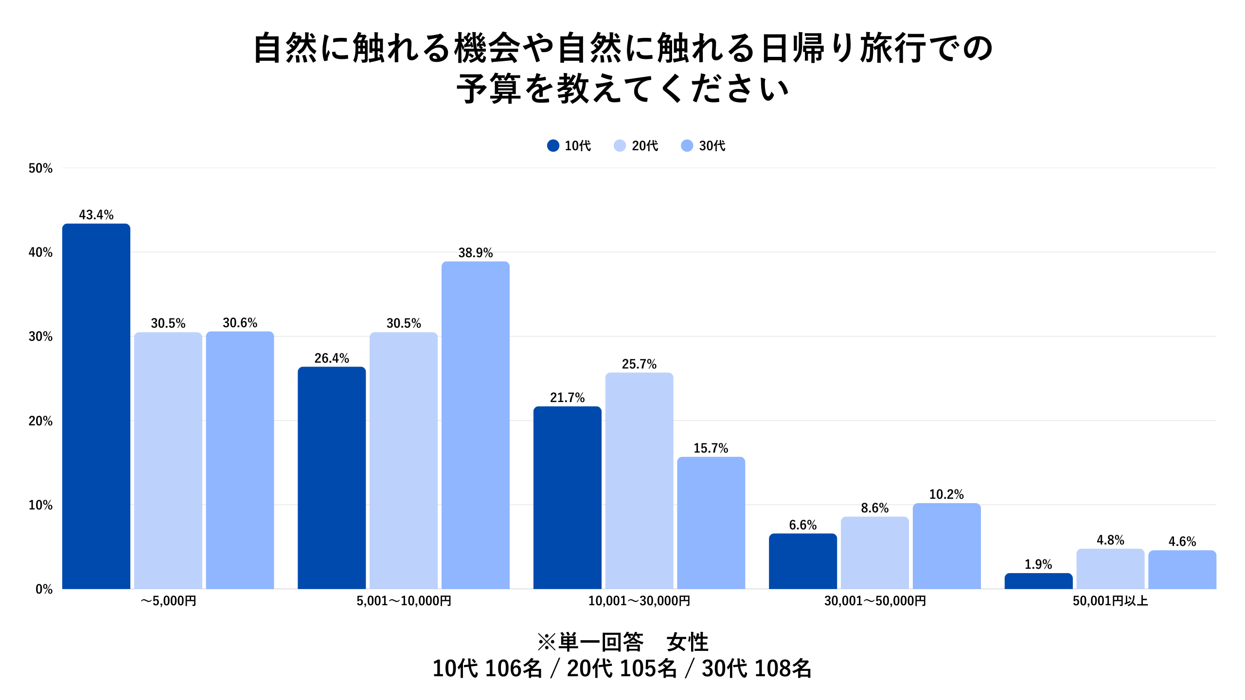 今回の調査では、10代は5,000円以下で済ませる女性が圧倒的でした。20代・30代女性は学生が減ることもあり、予算が倍以上上がることが予想されましたが、5,001~10,000円が最も多く、どの年代も10,000円以内に収めていることがわかりました。