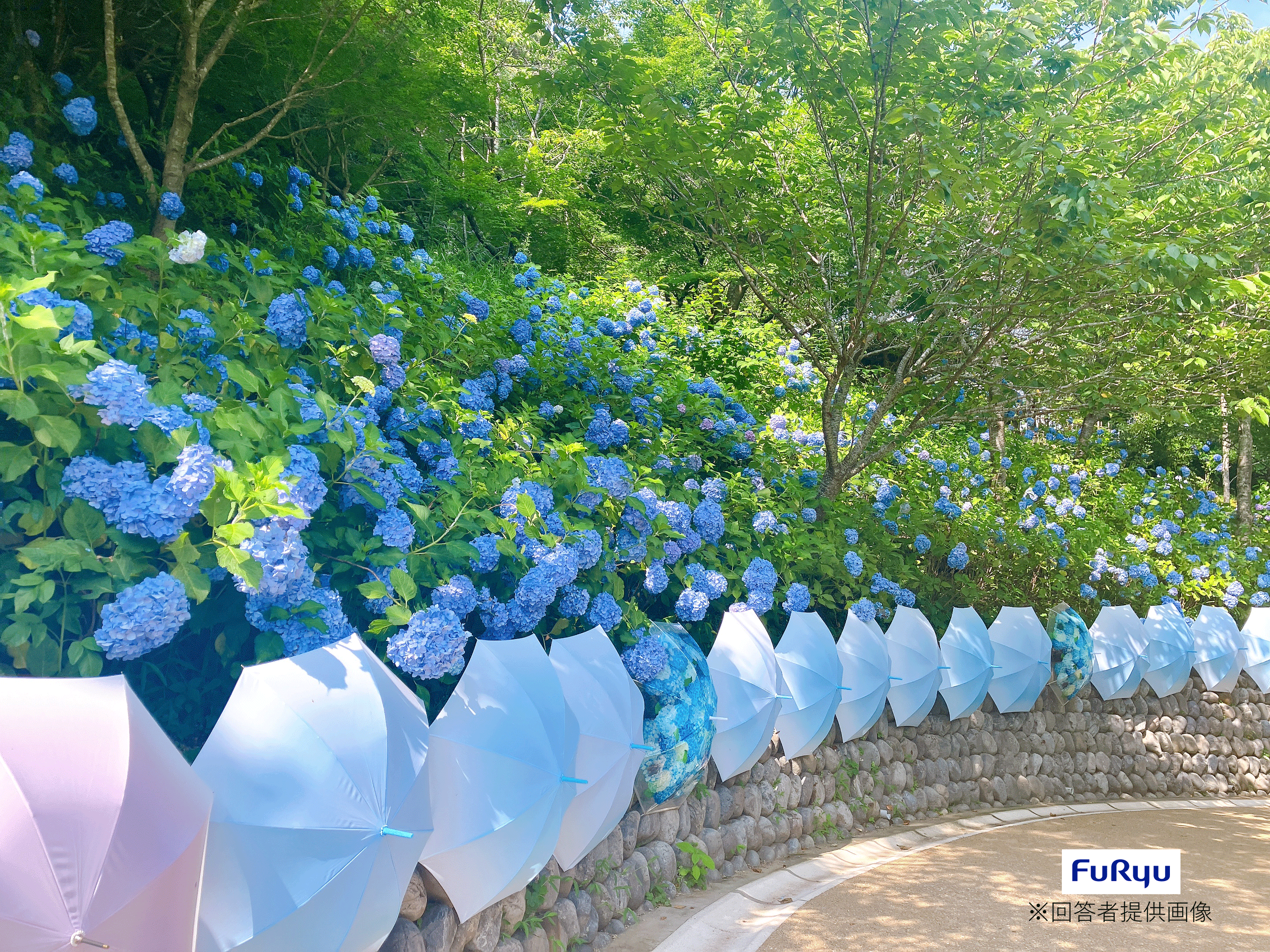 「紫陽花を見に、山の中にあるお寺に行きました。風鈴が飾られているところや、紫陽花と傘が並んでいるところが綺麗だったので写真を撮りました。」