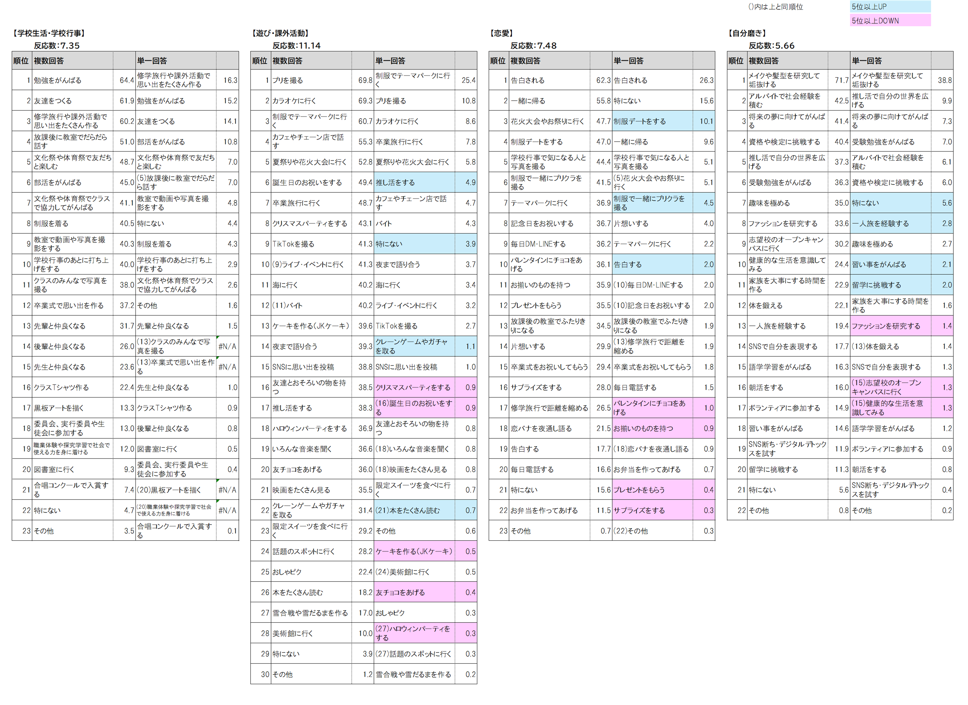 次に、恋愛テーマにおける順位変動の特徴としては、「特にない」がSAで2位まで上昇したことが挙げられます。また、MA設問、SA設問のいずれでも1位となった「告白される」の存在も目立ちます。MAでは「特にない」は21位と下位であり、学校生活テーマとほぼ同等の反応数が見られたことから、「もしそのような状況になればさまざまな体験をしてみたいとは思うが、それを自ら作り出す意願(=告白する)は高くない」と解釈できそうです。さらに、「友だちを作る」がMA/SAともに高順位である点からも、恋愛関係構築に対する受動的な姿勢が見られます(ただし、「友だちを作る」は能動的・受動的な問い分けがされていないため、友人関係構築に積極的に取り組む意欲の有無については本調査では判断できません)。