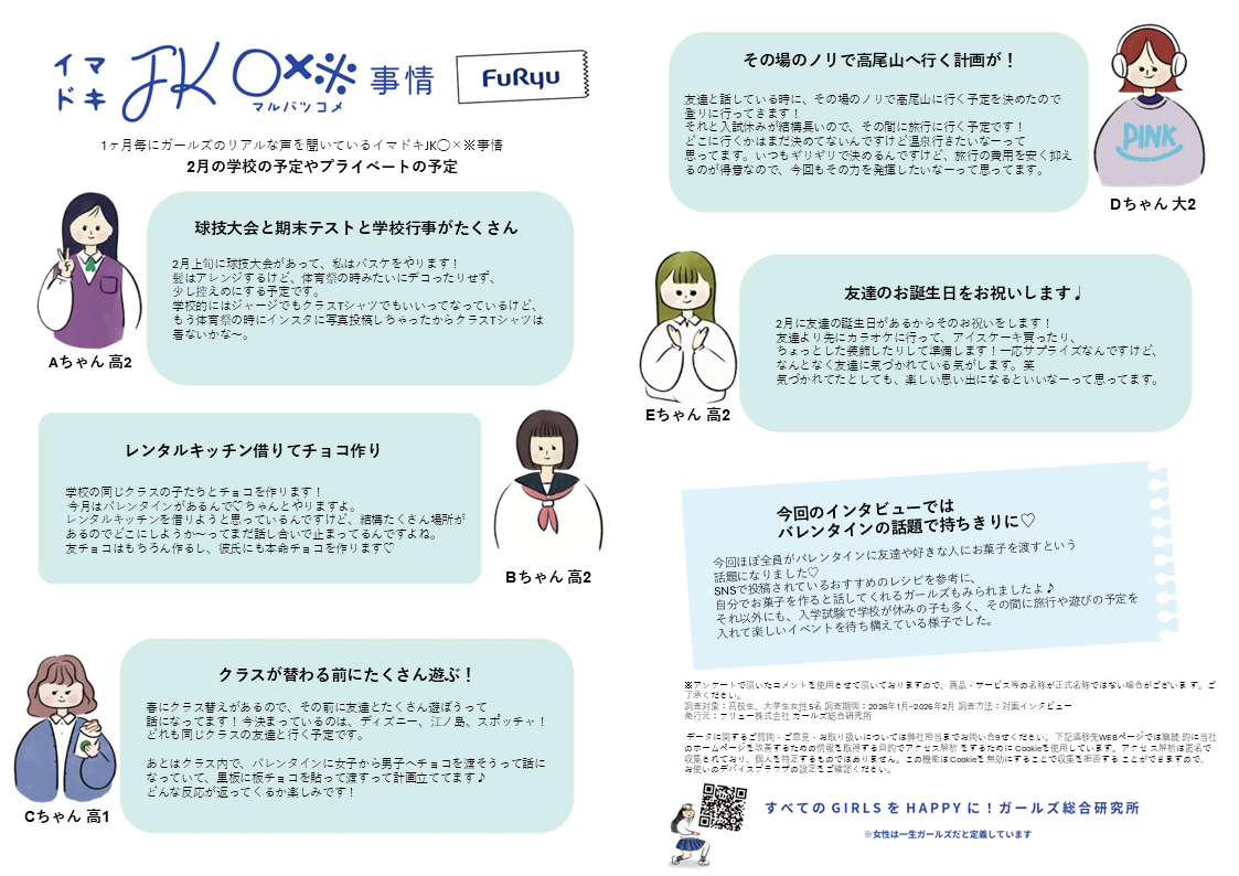 【毎月のJKの季節イベント事情】JK事情/26年2月 2026.02.27 この記事はメール会員登録でJK事情の高画質PDFデータがダウンロードが可能になりますので、ぜひダウンロードしてくださいね。 資料をダウンロード