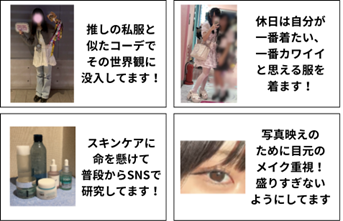 -Kさん: 好きなアイドルのライブに行く時は推しが私服でしているコーデを真似て、そのアイドルの世界観に入り込むことを重視したコーディネートをしています。
