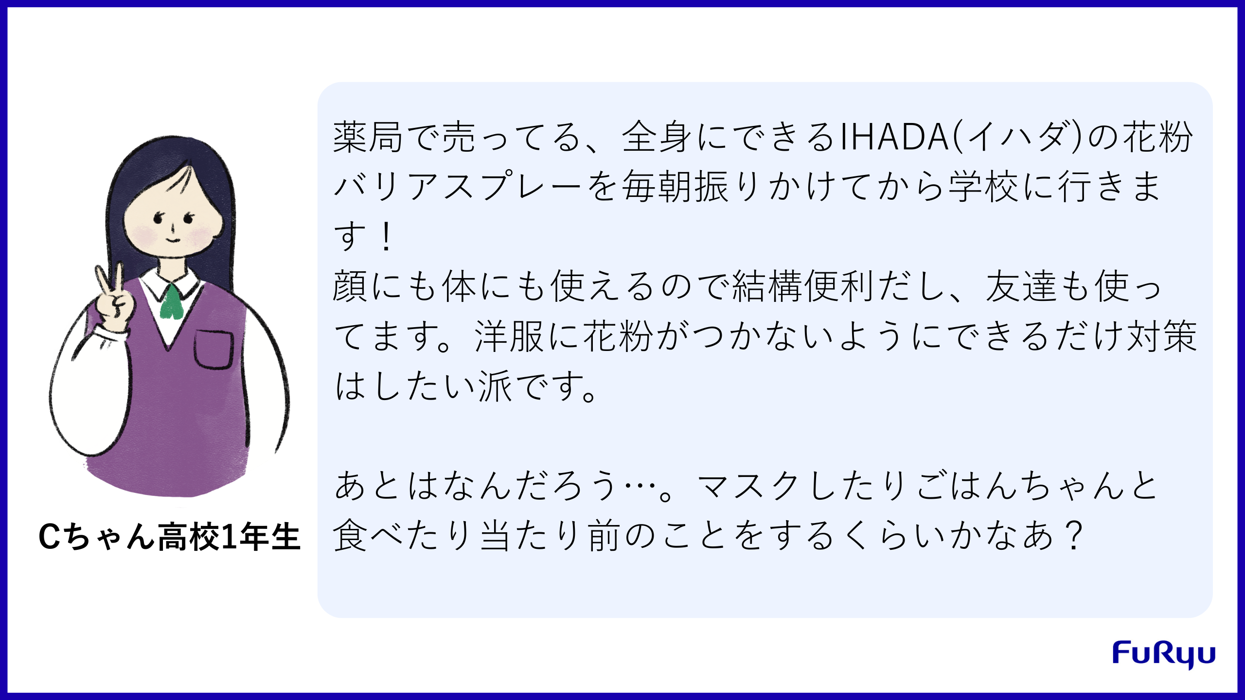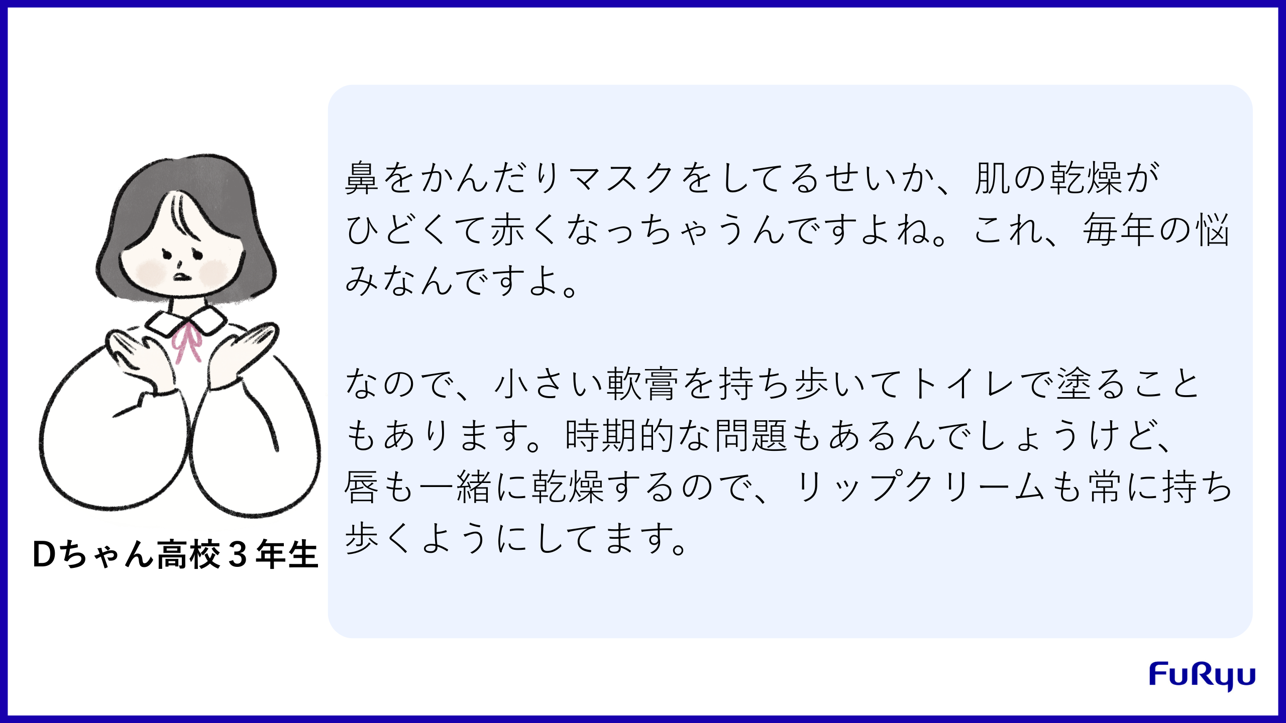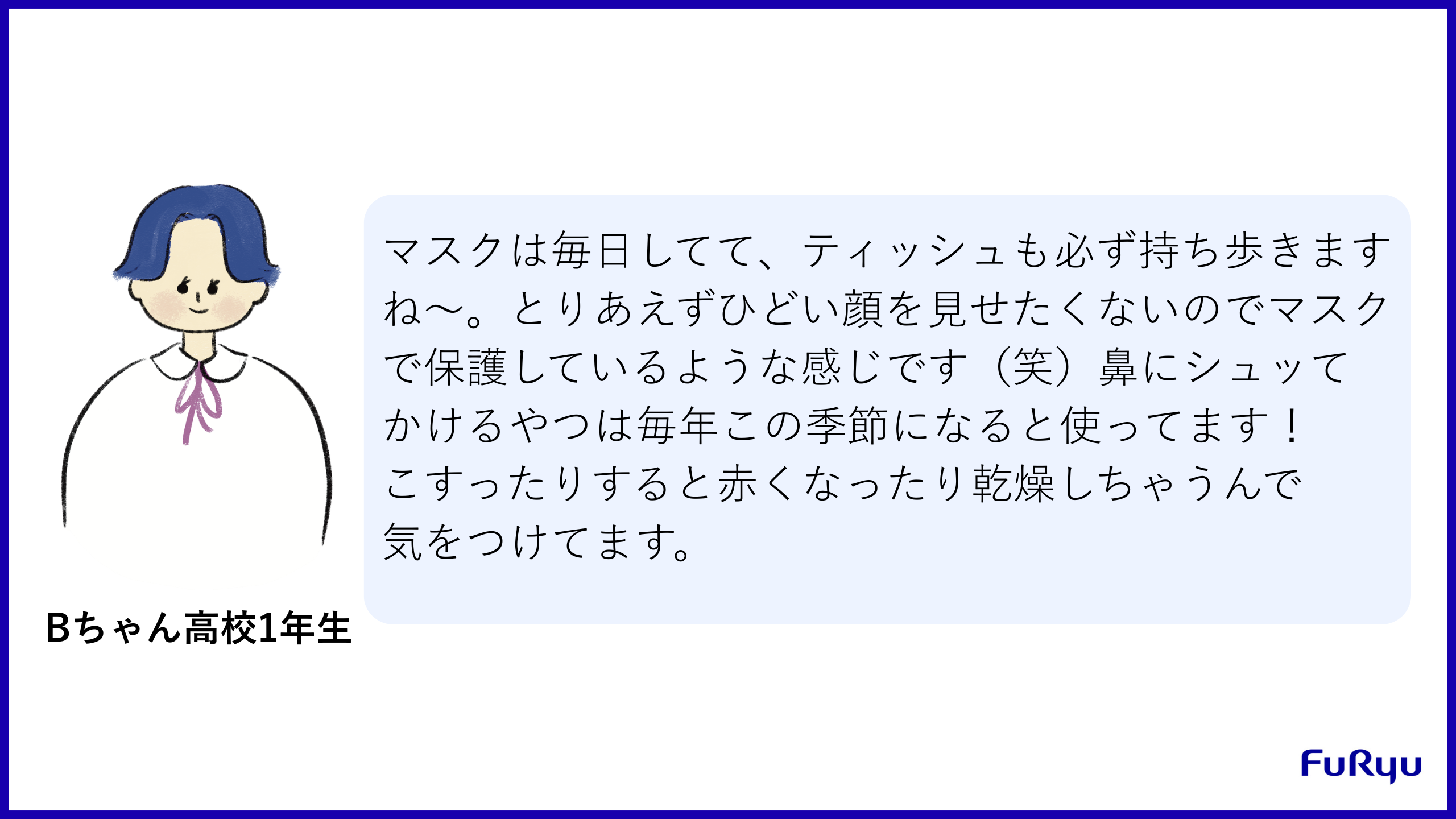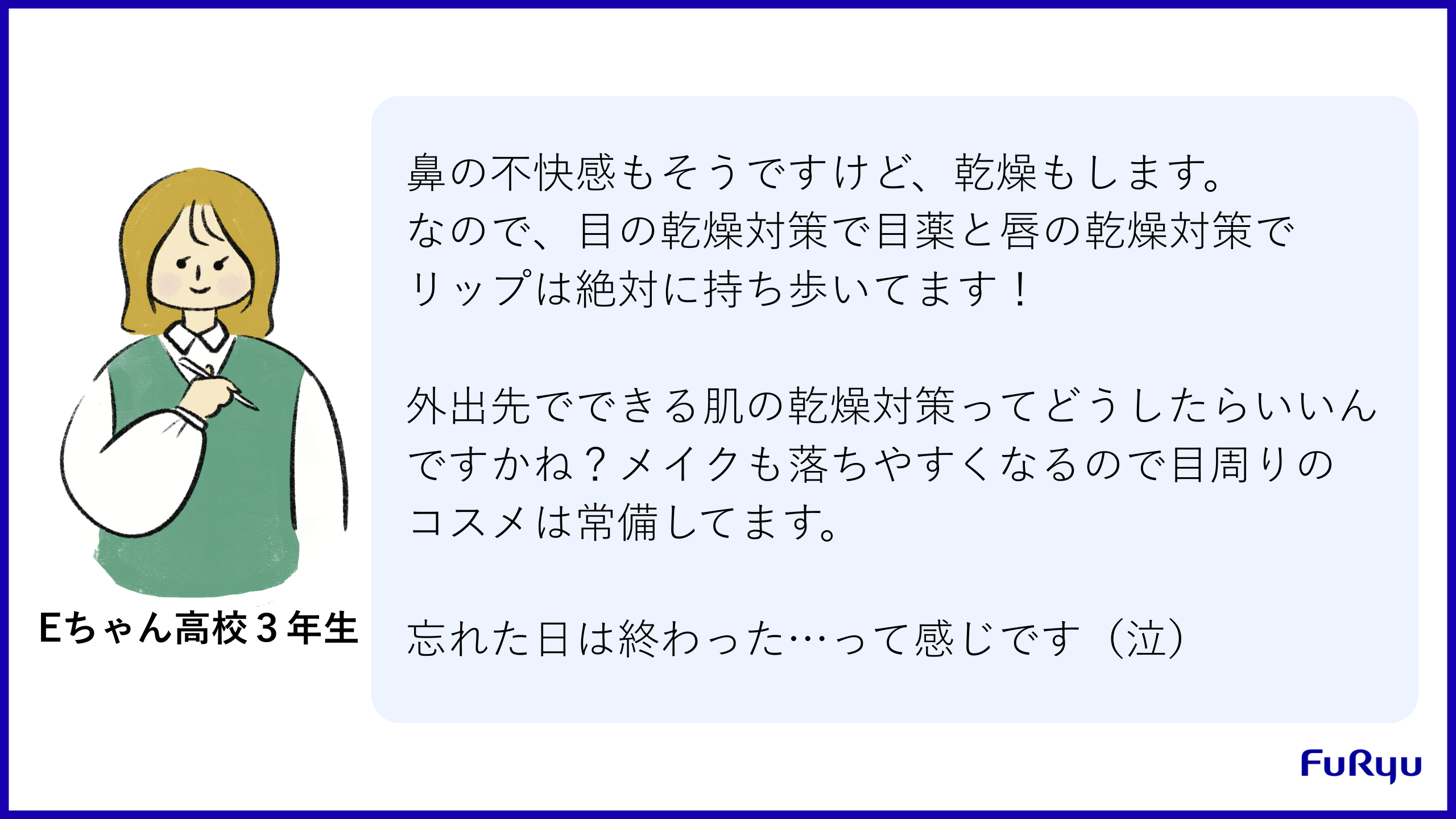 花粉の影響で見た目に支障が出ることを踏まえてマスクでカバーしている例です。乾燥対策のために気を遣っている様子も伺えますね。