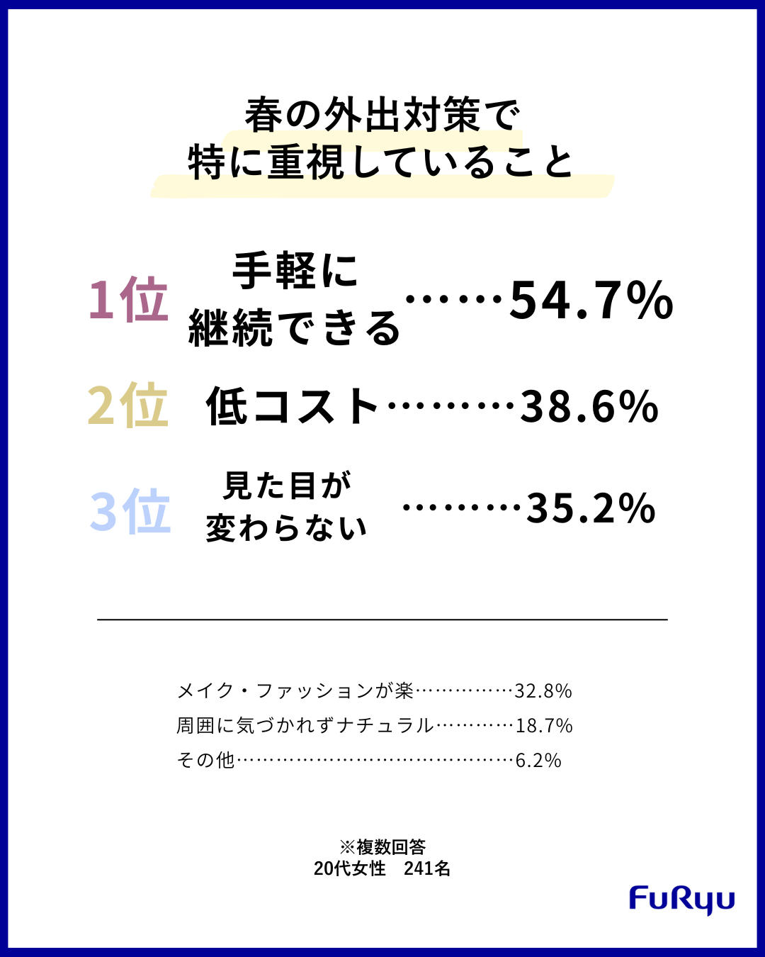 ところで、様々な対策をしているガールズが特に重視していることって何なんでしょう?ということで、実際に聞いてみたところ、「手軽に継続できる(54.7%)」が1位という結果になりました。外出対策は一日だけで終わることではありません。毎日継続しなければいけないことから、手軽さが重要視されているようです。次いで「低コスト(38.6%)」が2位ということで、1位の「手軽に継続できる」に通ずるものがあると筆者は感じています。手軽に継続するには、使用するものも低コストであることが条件になる方も少なくないと思うのです。今は何買うにしても高いですからね…。