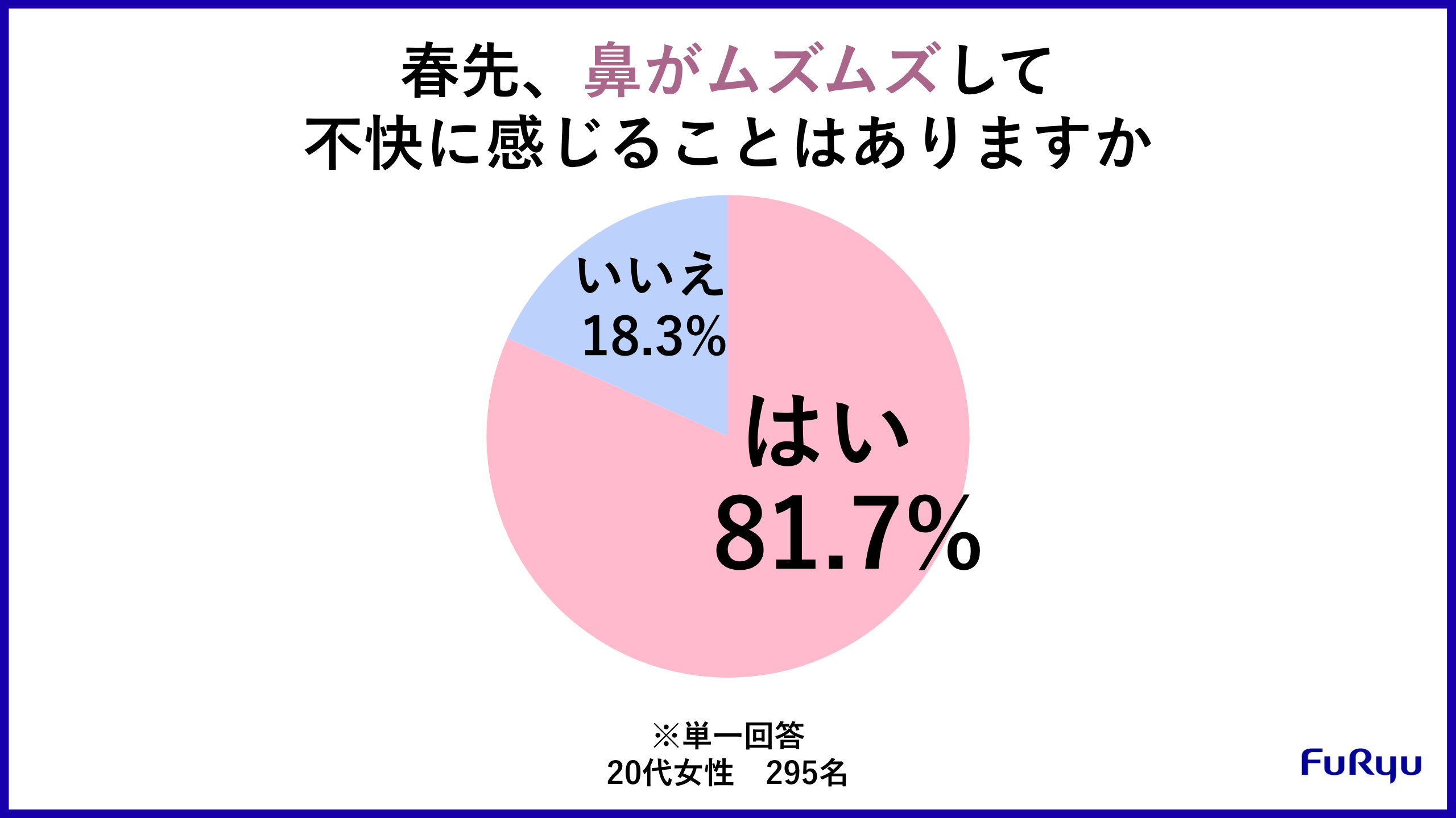 20代女性295名に「春先、鼻がムズムズして不快に感じることはありますか」と聞いたところ、81.7%の人が「はい」と答える結果に。やはり花粉の影響を感じている若年女性はかなり多いようです。