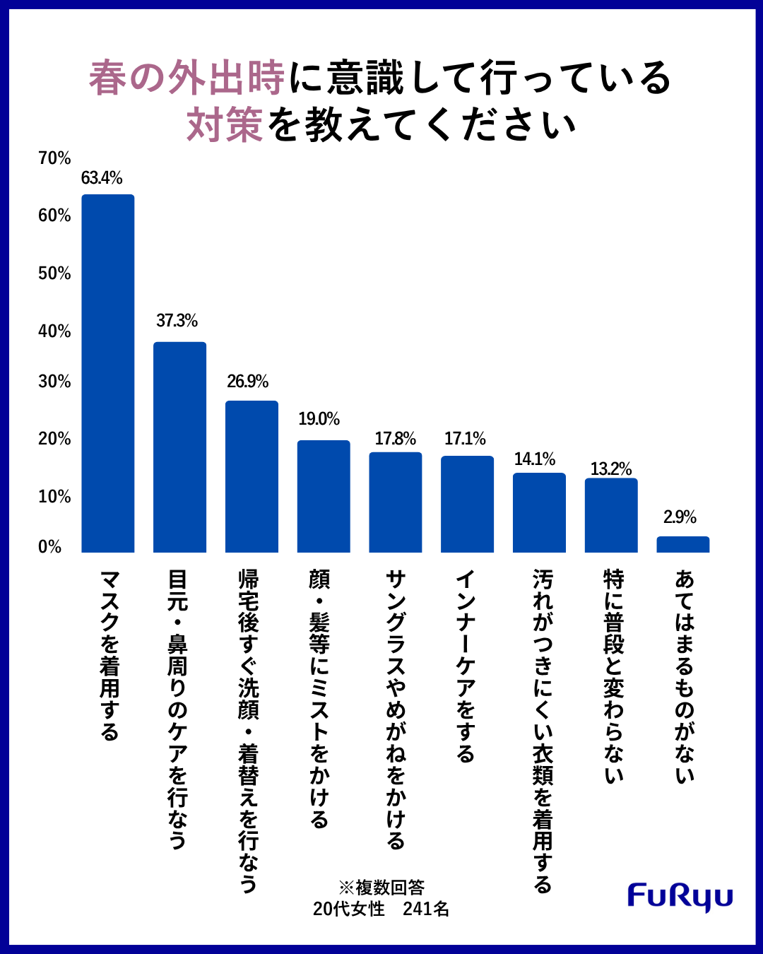 春になると鼻がムズムズして不快だと感じる20代女性241名にアンケートをとってみたところ、半分以上の方がマスクを着用して対策を行なっているということが分かりました。気軽にできることですし、使い捨てで衛生的にもいいので納得の結果です。